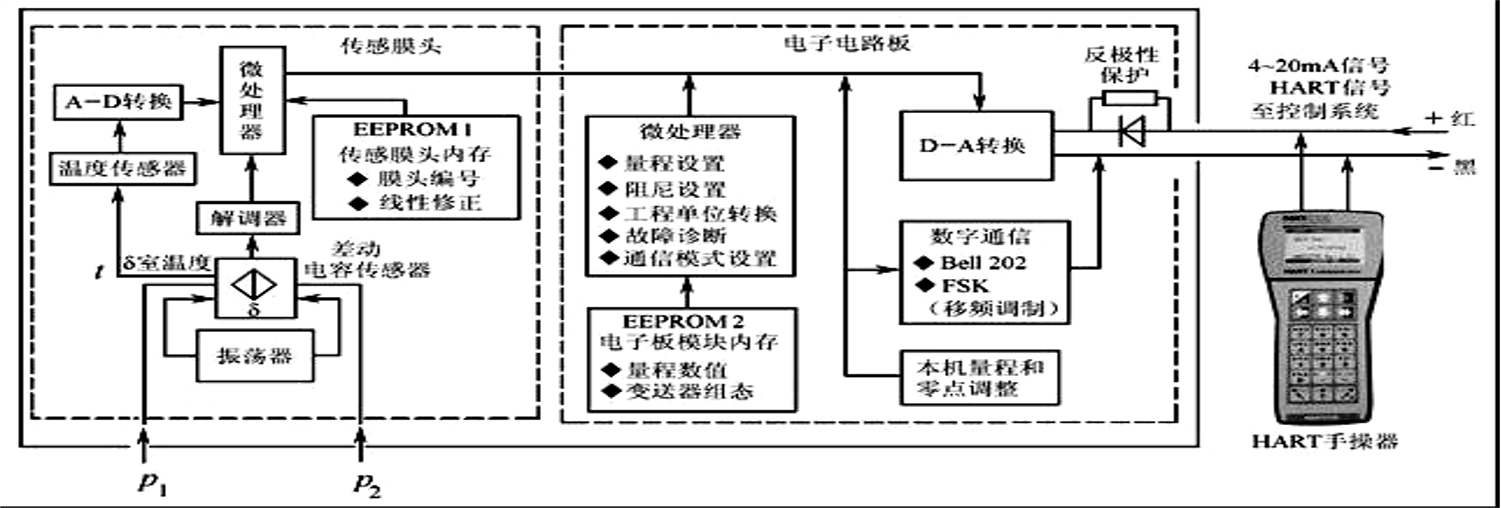 智能差壓變送器的工作原理框圖帶有液晶顯示器,與手持終端配合,可以在現(xiàn)場變送器的信號端子上,就地設定零點、量程;也可以在遠離現(xiàn)場的控制室中,或遠離危險的地方,將智能手持終端接到某個變送器的信號線上,進行遠程組態(tài)、測量范圍變更、變送器校準、故障自診斷。