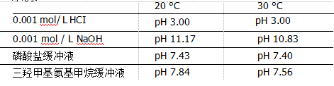 所有的測量溶液均有各自的特征溫度和 pH 關(guān)系(溫度系數(shù))。一般來說,您應(yīng)當(dāng)假定溫度變化會導(dǎo)致 pH 值變化(請見下方緩沖液/溫度表)。其原因是解離受溫度影響,從而導(dǎo)致 H+ 濃度發(fā)生變化。